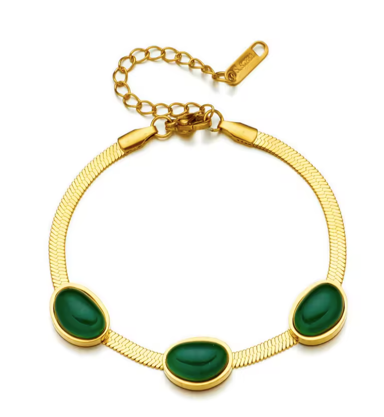 A gold-tone chain bracelet highlighted with three oval-cut green stones, blending vibrant charm with timeless sophistication