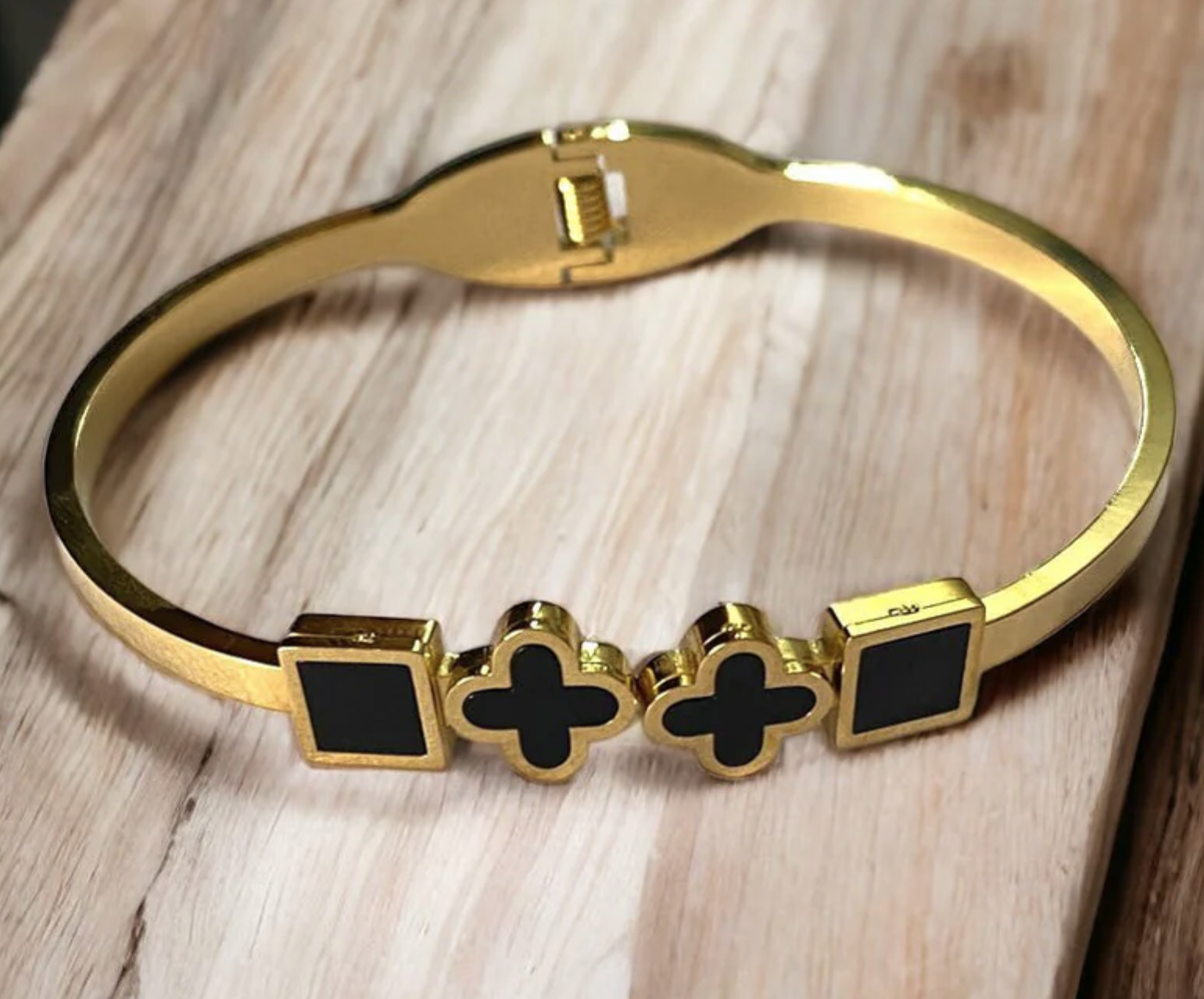 A polished gold-tone bracelet adorned with dual black clover motifs and geometric accents.