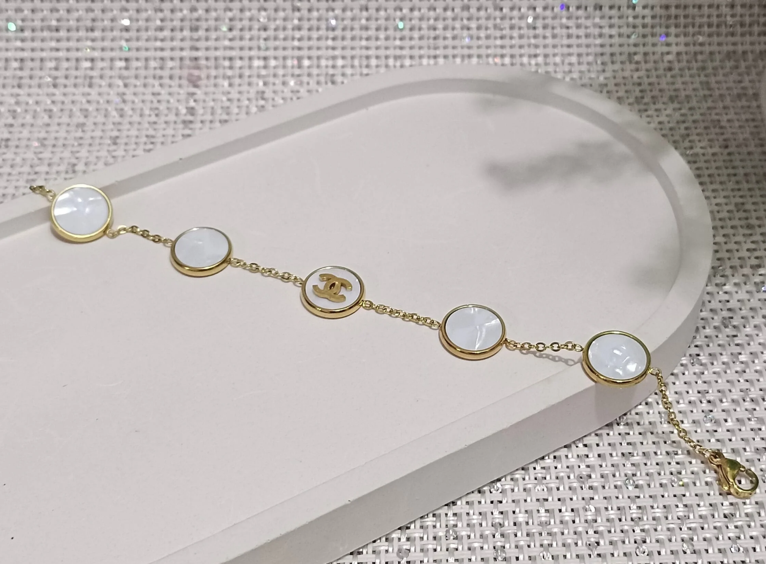 A delicate gold-tone chain bracelet adorned with luminous white medallions and a central emblem charm